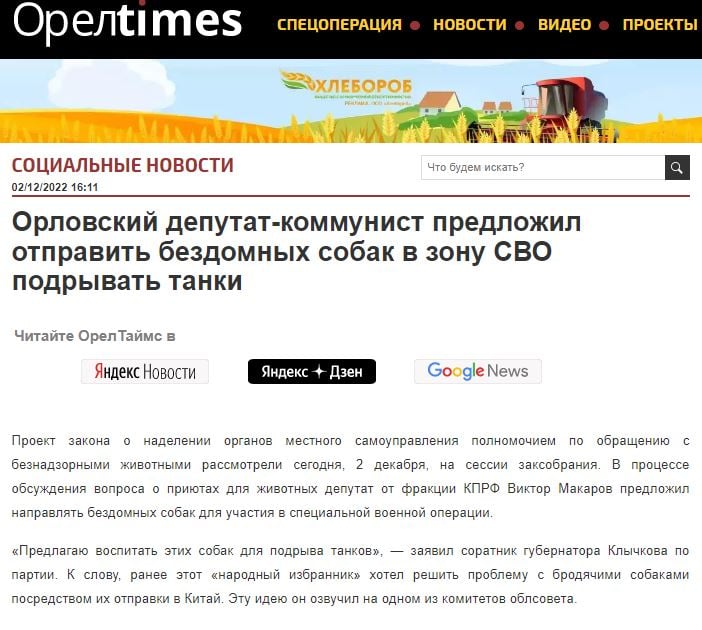 Очередное сумасшествие было озвучено российским чиновником. В Орловской области РФ на заседаниикомитета облсоветадепутат Госдумы от фракции КПРФ Виктор Макаров предложил направлять бездомных собак для участия в “специальной военной операции”.